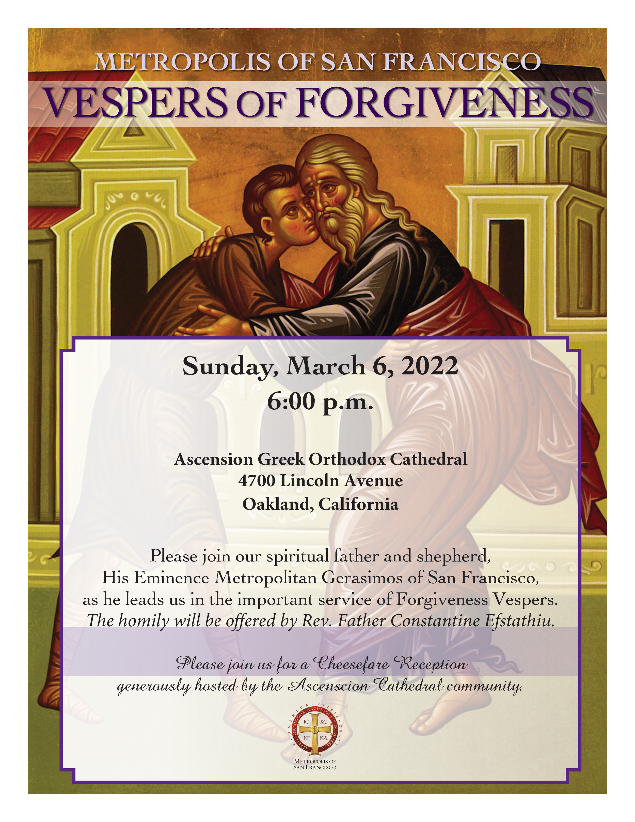 The faithful in northern California are invited to join His Eminence Metropolitan Gerasimos of San Francisco for the Vespers of Forgiveness to be prayed at 6:00 p.m. on Sunday, March 6, 2021 at the Ascension Greek Orthodox Cathedral in Oakland, California. A homily will be offered by Rev. Father Constantine Efstathiu. Please join us in prayer for this beautiful way to begin our journey through Great Lent by reconciling ourselves with one another and seeking forgiveness.